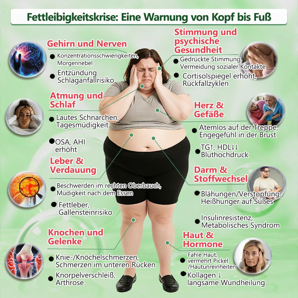 Viele glauben, Übergewicht habe nur mit dem Aussehen zu tun – doch im Inneren bringt es deine Gesundheit still und leise in Gefahr. Bauchfett kann auf Herz und Lunge drücken, sodass sich jeder Atemzug und jeder Schritt schwerer anfühlt. Es kann deine Arterien verengen und das Risiko für einen Herzinfarkt oder Schlaganfall erhöhen. Und Jahr für Jahr beschleunigt diese Belastung den Alterungsprozess, schwächt Organe und raubt dir die Energie, die du brauchst, um das Leben in vollen Zügen zu genießen.